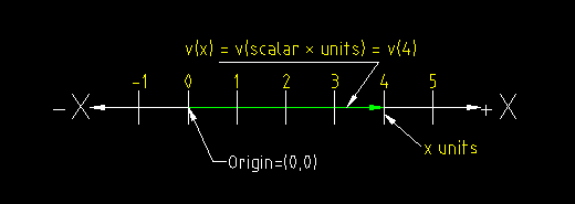 Scalars can be thought of as the same as units but I like to think of them differently when it comes to Vectors. A unit (for our purposes) is an amount of measurement such as an inch, millimetre or foot that we use to to get to our point by saying something like – “walk 4 feet in the ‘x’ direction then 6 feet in the ‘y’ direction” to get to your point. With Vectors you multiply a ‘unit’ by a ‘scalar’ to get these distances where a scalar is a ‘real’ number and not a unit of measurement. It’s the same as saying “walk 4 x 1 foot in the ‘x’ direction…yada, yada”. This will become clearer after I explain ‘unit vectors’.